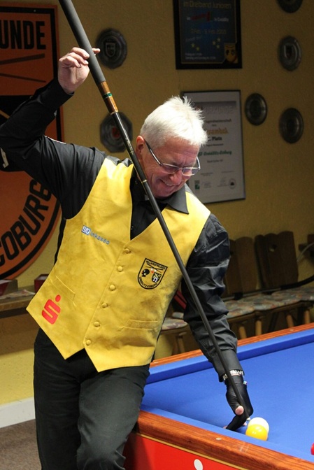 Folker Koch, der etwas zu spät ins Spiel kam, sich dann aber noch enorm steigerte, musste die Einband-Partie zum Schluss mit einem Abstand von nur 8 Punkten abgeben.
