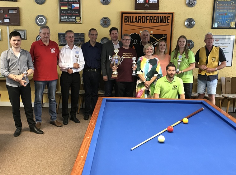 Mit viel Humor nahmen es die Spieler der Billardfreunde hin, dass diesmal die Sportsfreunde aus Weida, die vom deutschen Meister Manuel Orttmann in der Freien Partie und dem sechsfachen ehemaligen DDR-Meister und einmaligen deutschen Meister im Einband, Axel Büscher, unterstützt wurden. Diese traten unter diesem Namen das erste Mal im Billardzentrum an und konnten prompt die Trophäe mit nach Hause nehmen.